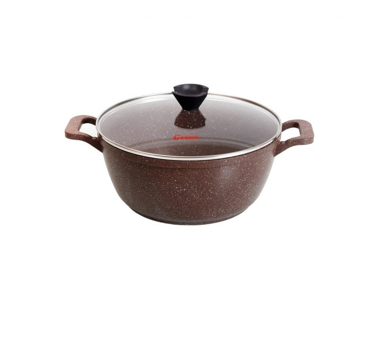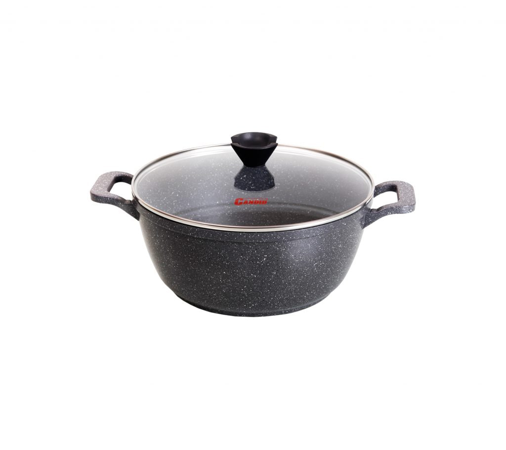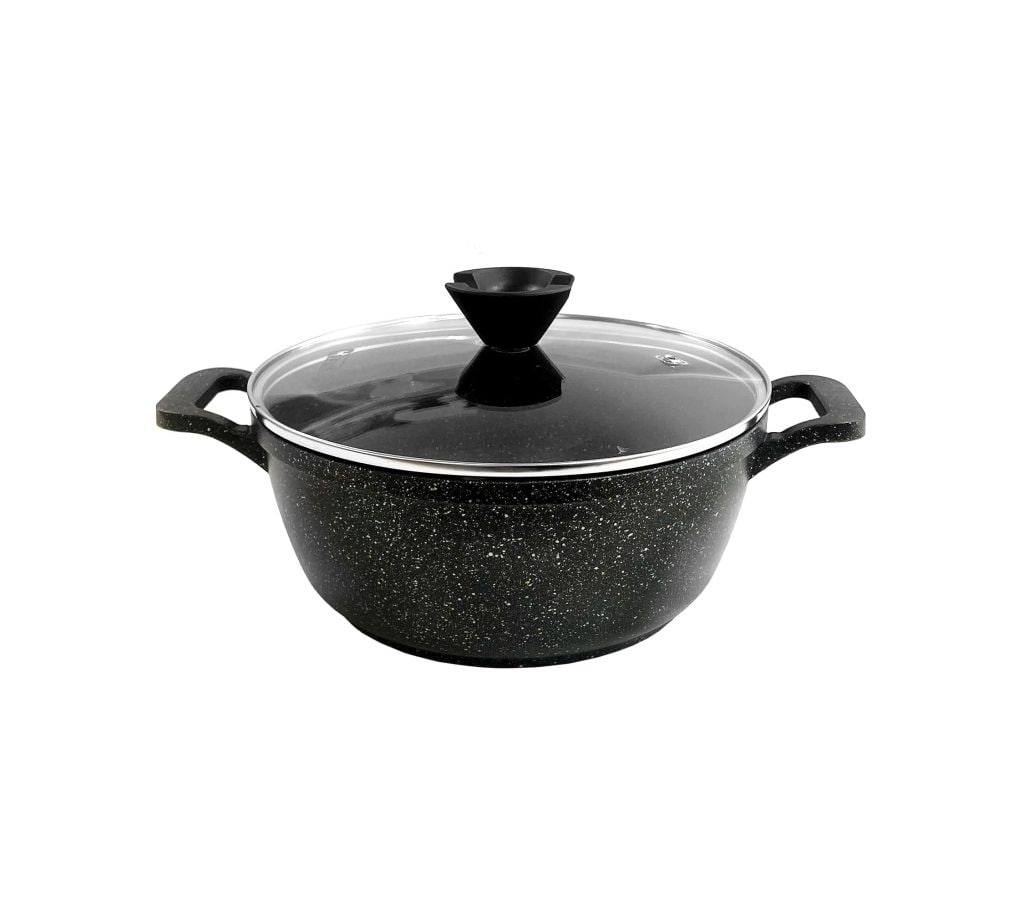 پوشش داخلی نچسب و مقاوم، شستوشو را آسان کرده و ظاهر گرانیتی مشکی، جلوهای شیک و حرفهای به آشپزخانه شما میدهد. درب شیشهای مقاوم حرارت همراه با دستههای ارگونومیک باکالیت، استفاده از این قابلمه را ایمن و راحت میکند.