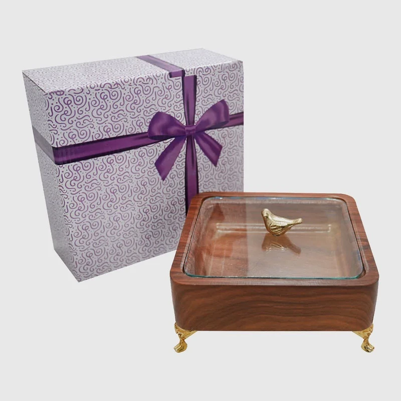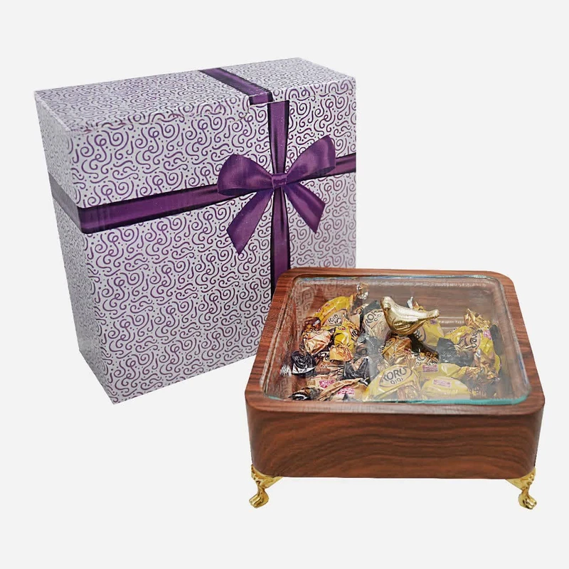 شکلاتخوری مدل مربع EF_047 با طراحی چوبی و درب شیشهای، انتخابی شیک و خاص برای پذیرایی یا هدیه است.