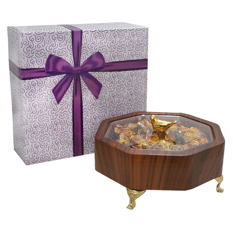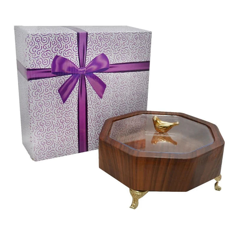 شکلاتخوری هشتضلعی با طرح چوب و پایههای فلزی طلایی، درب شفاف و پرندهی طلایی دکوری. انتخابی زیبا برای پذیرایی یا هدیه.