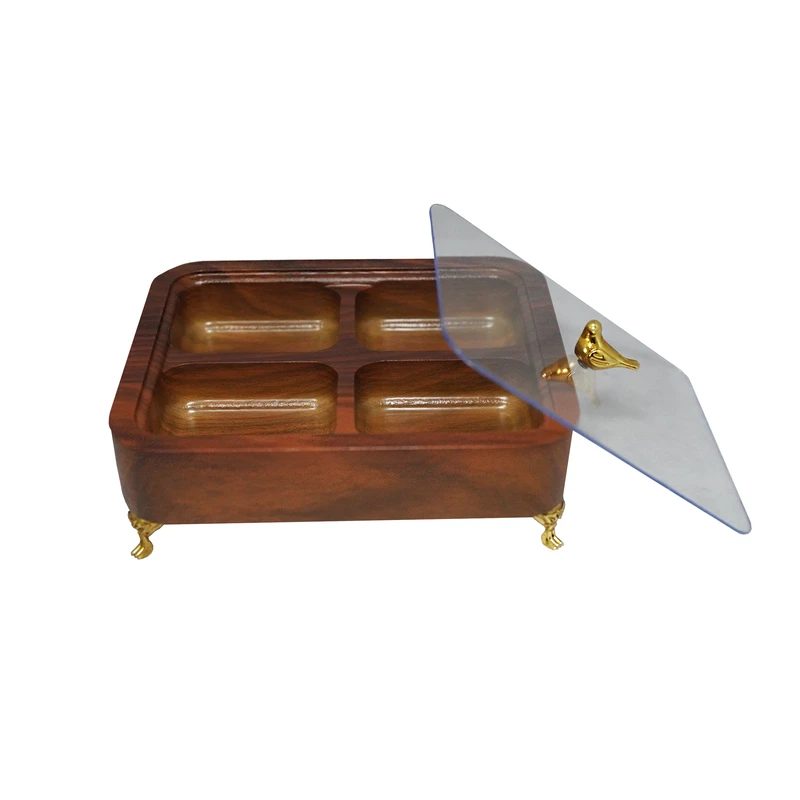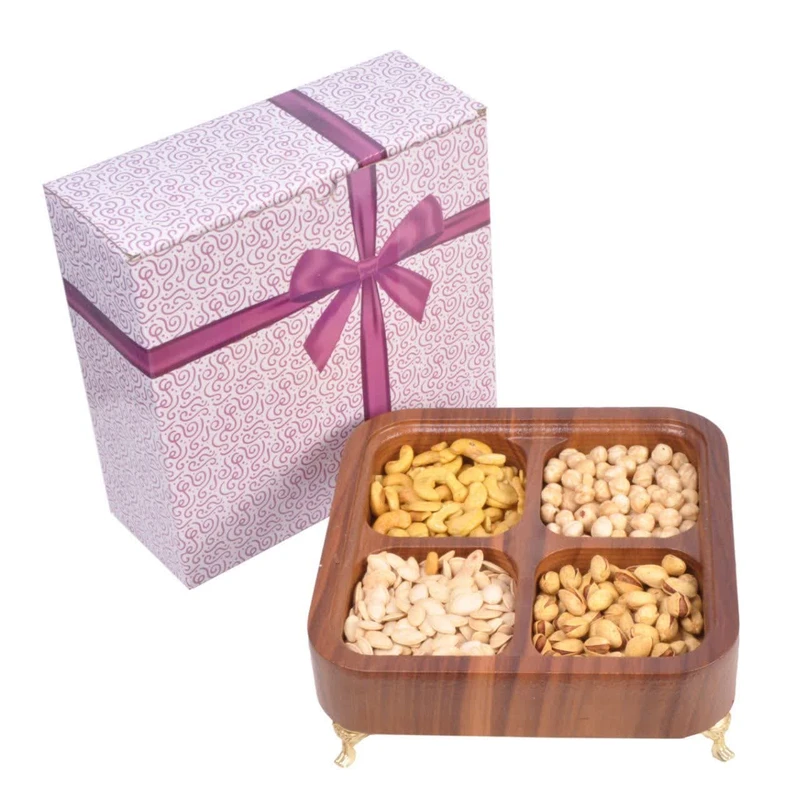 اردوخوری مدل چهارخانه EF_07 با طراحی چوبی و پایههای طلایی گزینهای زیبا برای پذیرایی یا هدیه است. دارای چهار بخش مجزا و جعبه کادویی شیک – ارسال از رشت با بستهبندی هدیهای.
