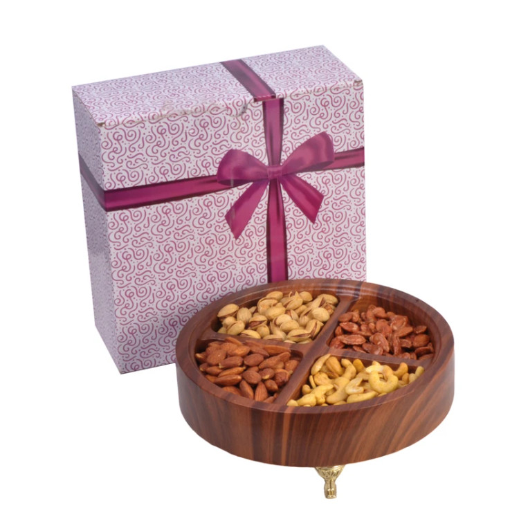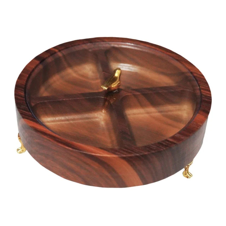 اردوخوری گرد چوبی با چهار بخش مجزا و پایههای طلایی براق؛ مناسب سرو خشکبار، آجیل و تنقلات با بستهبندی کادویی زیبا.