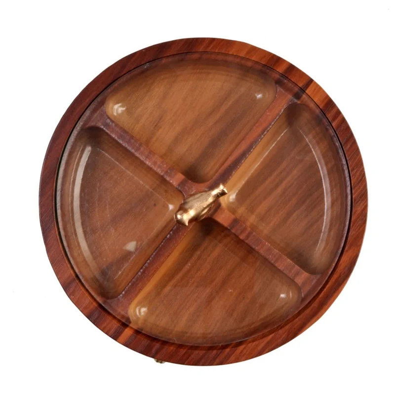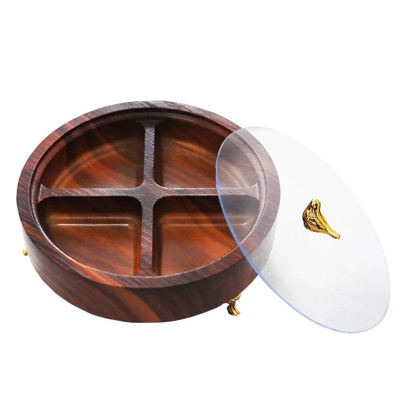 اردوخوری گرد چوبی با چهار بخش مجزا و پایههای طلایی براق؛ مناسب سرو خشکبار، آجیل و تنقلات با بستهبندی کادویی زیبا.