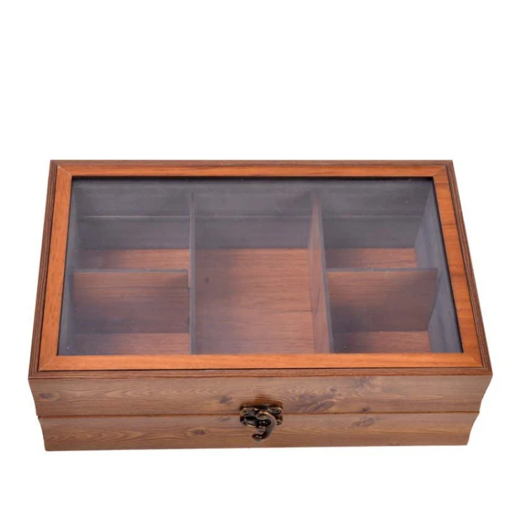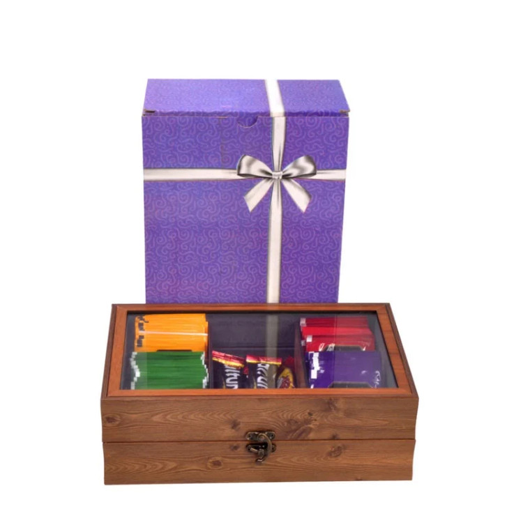 جعبه پذیرایی چوبی با درب شیشهای و قفل فلزی آنتیک، مناسب نگهداری تیبگ، شکلات و دمنوش با بستهبندی هدیهای شکیل.