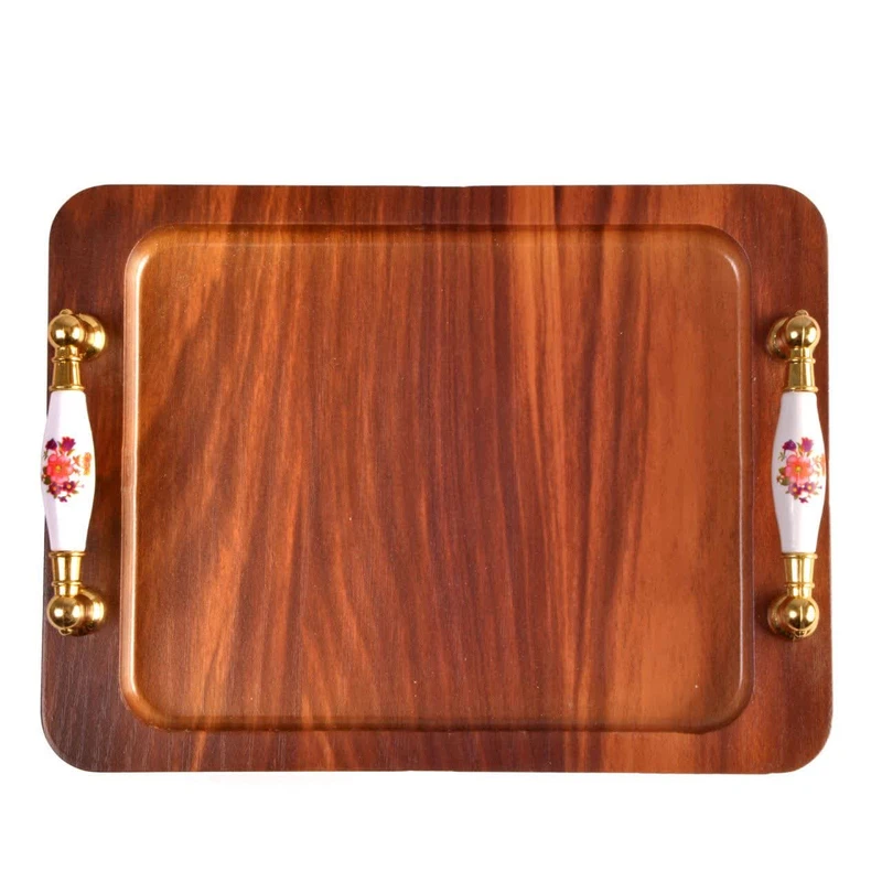 ست سهتکه سینی چوبی با رنگ گردویی و دستههای فلزی طلایی با سرامیک طرح گل – مناسب پذیرایی شیک و رسمی.