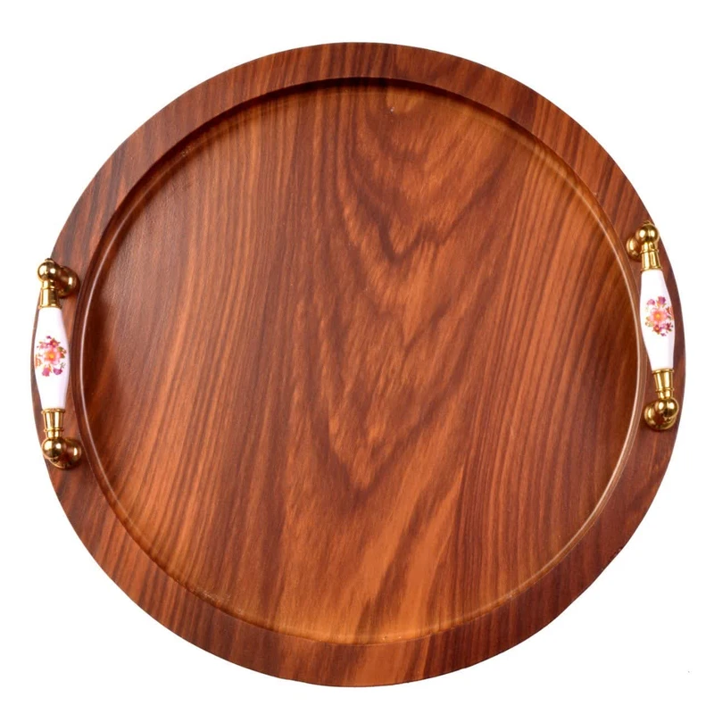 ست سهتکه سینی چوبی گرد با رنگ گردویی و دستههای فلزی طلایی سرامیکی طرح گل، مناسب پذیرایی لوکس و چیدمان منزل.