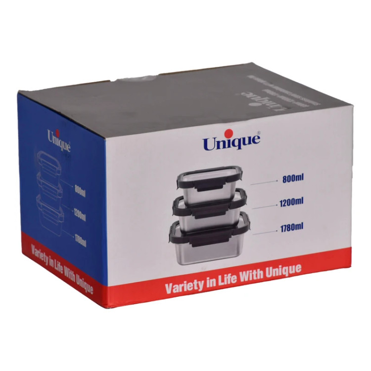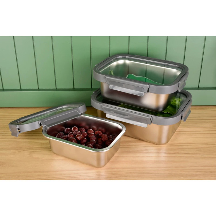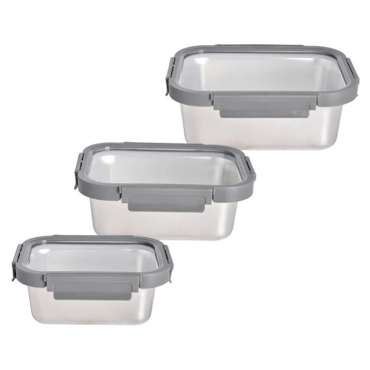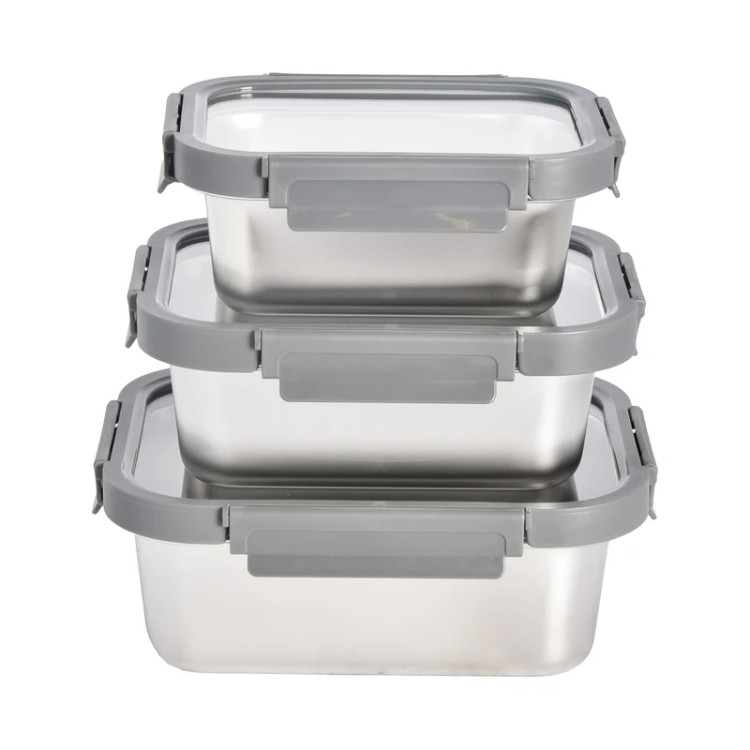 ست سهتکه ظرف نگهدارنده غذا از جنس استیل ضدزنگ با درب پلاستیکی قفلدار و نوار سیلیکونی ضدنشت – مناسب یخچال، فریزر و سفر.