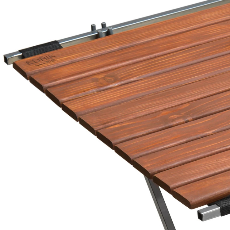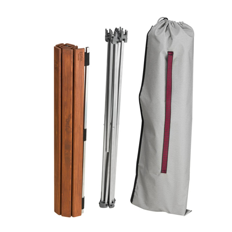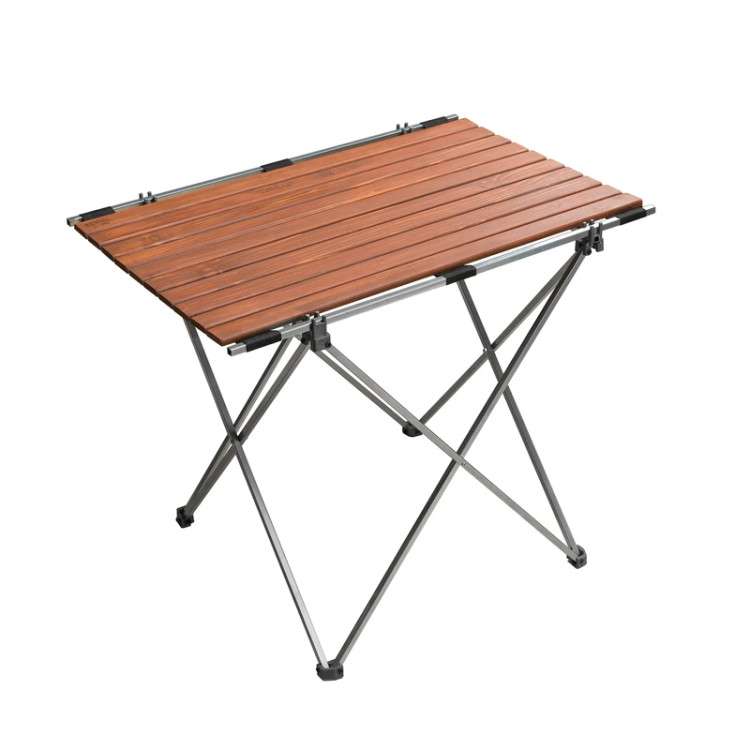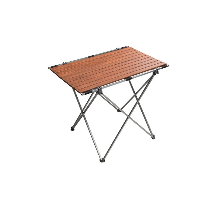 میز تاشو سبک با صفحه چوبی مقاوم و پایههای آلومینیومی، ایدهآل برای کمپینگ، مسافرت و استفاده در فضای باز. جمعوجور و قابل حمل با کیف مخصوص.