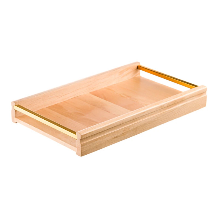 سینی چوبی لوکس ساختهشده از چوب طبیعی مرغوب با دستههای طلایی آبکاریشده، مناسب پذیرایی شیک در مهمانیها و استفاده روزمره.