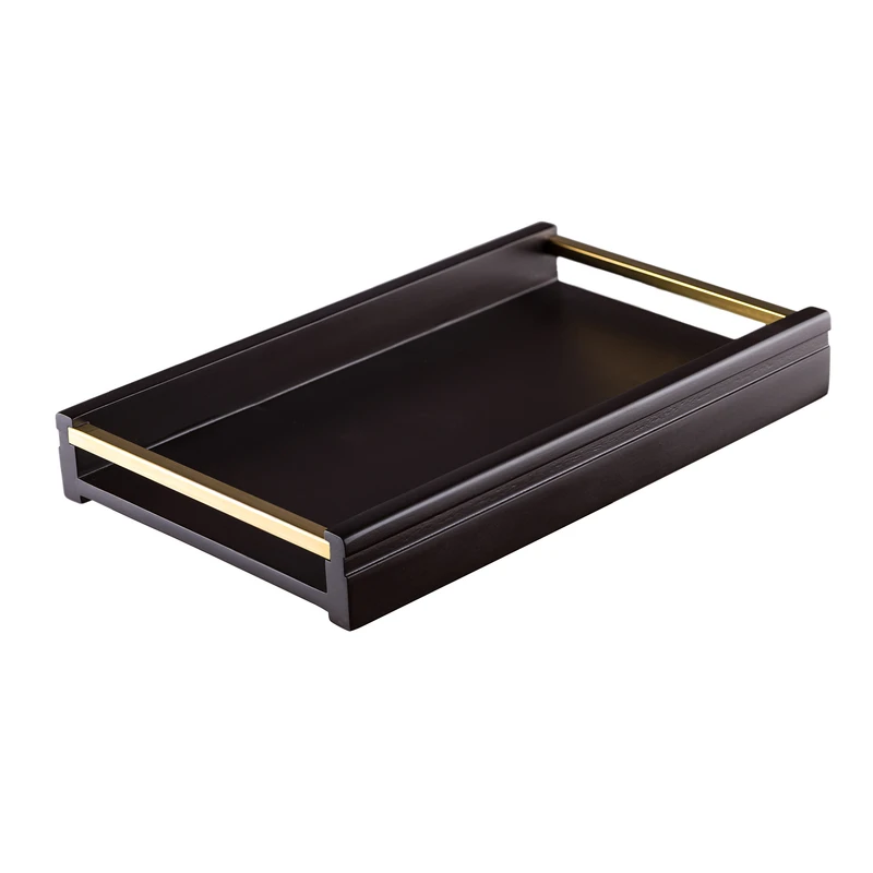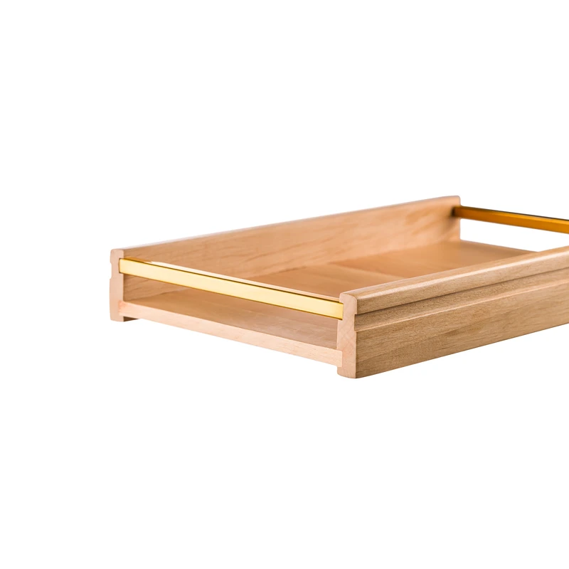 سینی چوبی لوکس ساختهشده از چوب طبیعی مرغوب با دستههای طلایی آبکاریشده، مناسب پذیرایی شیک در مهمانیها و استفاده روزمره.
