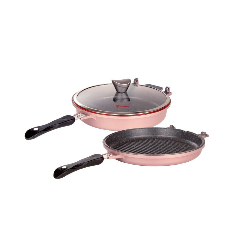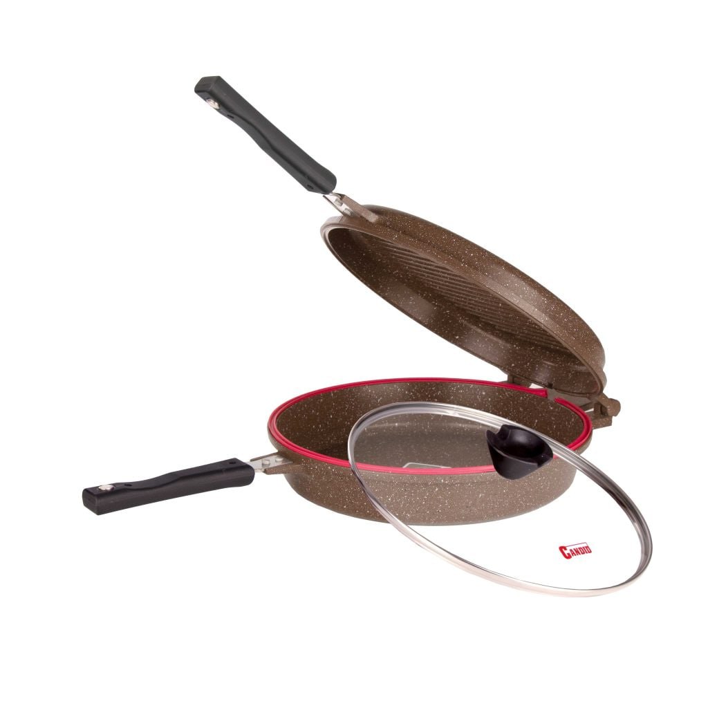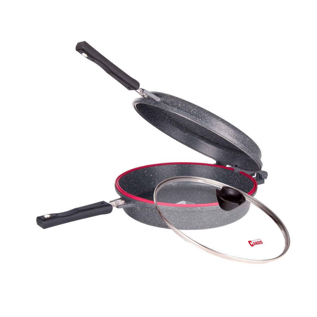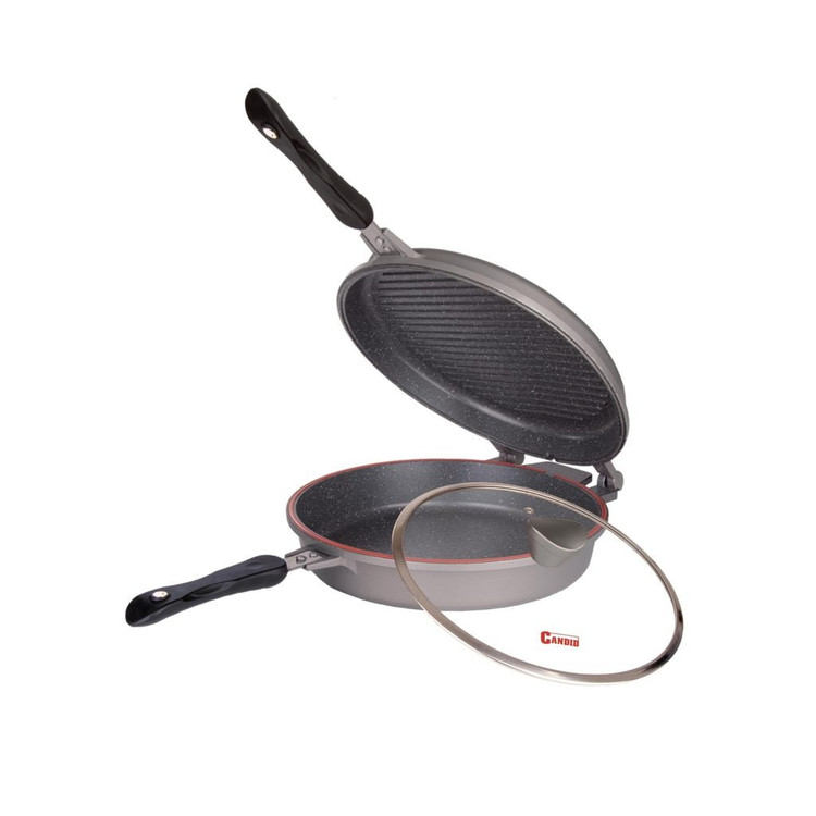 تابه رژیمی دوطرفه کاندید مدل گرد سایز 28 یک انتخاب فوقالعاده برای افرادی است که غذاهای سالم، کمروغن و خوشطعم را ترجیح میدهند. طراحی گرد و دربهای مغناطیسی آن باعث میشود مواد غذایی با حفظ رطوبت و حرارت بهطور یکنواخت پخته شوند. بدنه آلومینیومی دایکاست به همراه پوشش گرانیتی ضدخش، علاوه بر دوام بالا، باعث میشود ذرات غذا به کف تابه نچسبند و شستشو آسان باشد. نوار سیلیکونی دور درب نیز مانع خروج بخار و عطر غذا میشود و نتیجه کار، غذایی خوشپخت و آبدار خواهد بود.